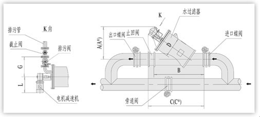 型號(hào) | 管徑 (mm) | 過濾流量 (m3/h) | 過濾面積 (cm3) | 排污閥DN (mm) | 一次清洗 水量(L) | 電機(jī)功率 (KW) | 重量 (Kg) | D (mm) | A (mm) | A (mm) | B (mm) | C (mm) | C (mm) | L (mm) | G (mm) |